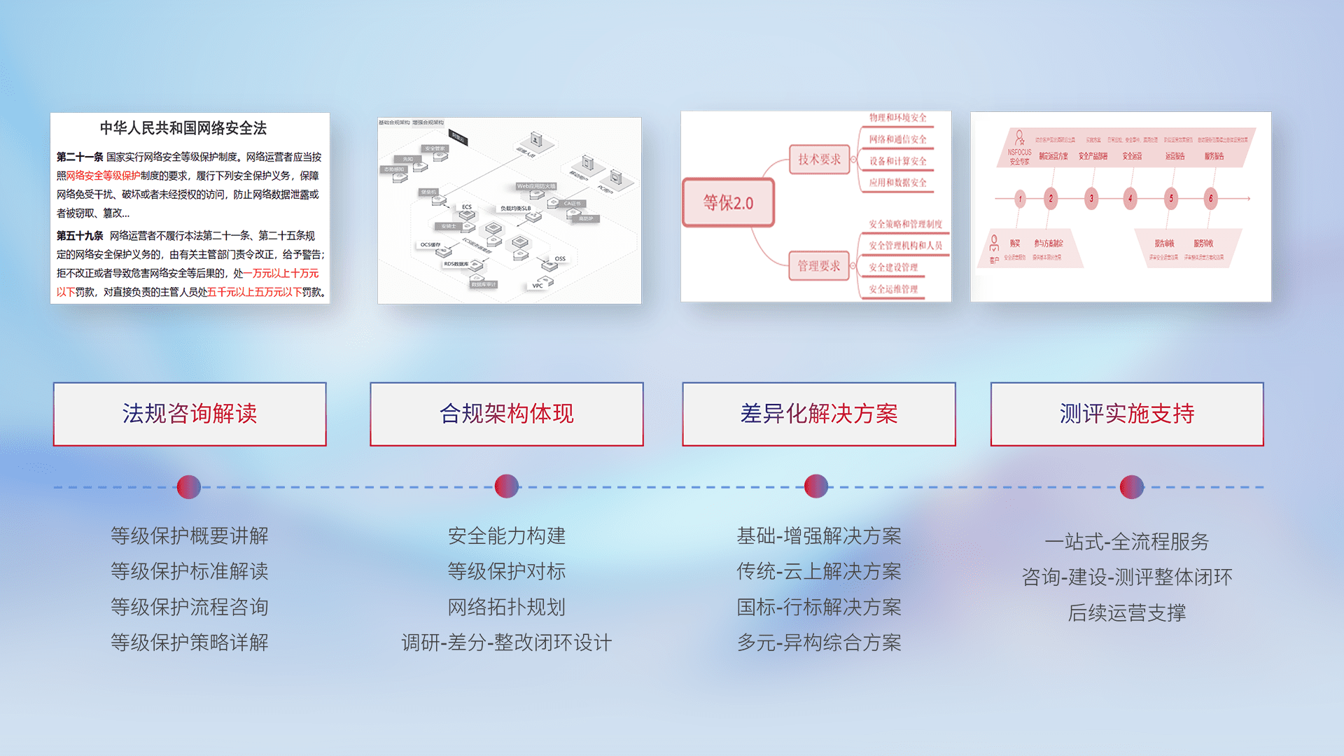通过专业的法律咨询解读、、、合规架构体现、、差异化解决方案、、、、测试实施支持等服务,,,为客户量身打造等保合规体系。。